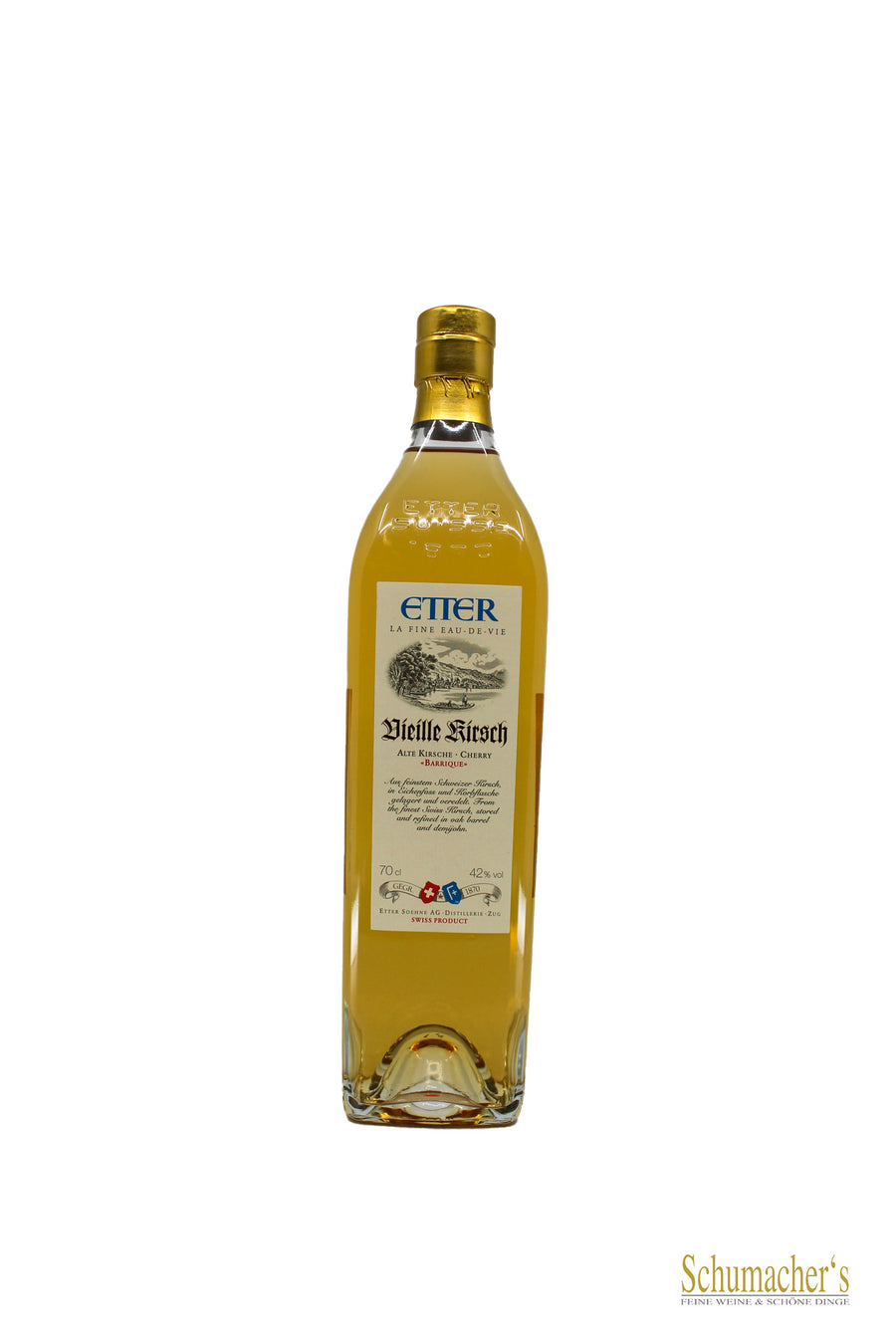 Herkunft Früchte: aus der Kirschenregion Zugersee / Schweiz Frischfruchtmenge: 9 kg Bergkirschen für 70cl Inhalt Lagerung/Reifung: 3 bis 5 Jahre in Barrique und 50-Liter- Korbflaschen Farbe: goldbraun Bouquet: sanft, aromareich, vollfruchtig Geschmack: mild, zartfruchtig und harmonisch, mit feinen Holz- und Vanillenoten Genusstipp: Ein idealer Digestif (französisches Wort für „Verteilerli“), der ein gediegenes Essen durch seine Eleganz und grandiose Geschmacksharmonie hervorragend abrundet. Kosten Sie diesen vollmundigen Fruchtbrand aus einem tulpenförmigen Glas, damit sich das Bouquet schön entfaltet und die Aromen konzentriert zum Vorschein kommen. Auszeichnung: „Kirsch-Trophy“ Edelbrand des Jahres 2012 Sieger in der Kategorie „Vieille-Produkte“